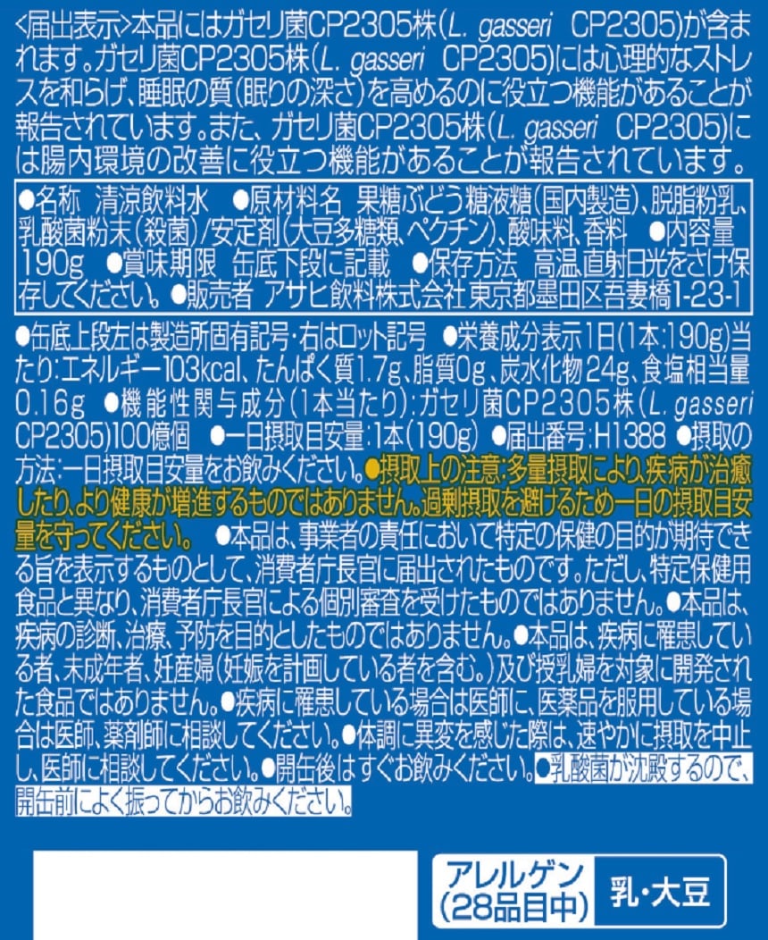 「カルピス」由来の乳酸菌研究により選び抜かれたガセリ菌CP2305株100億個入りで、睡眠の質向上や腸内環境改善に役立つ「届く強さの乳酸菌」を詰め合わせた乳性飲料。