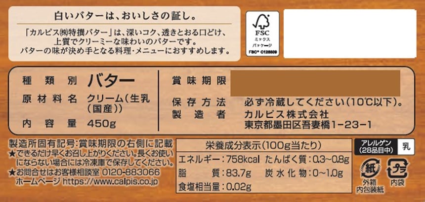 【おいしさの秘密】「カルピス(株)特撰バター」は、乳酸菌飲料カルピスⓇをつくる工程で生乳から乳脂肪を分離するときにできる脂肪分(クリーム分)から生まれたのが始まりです。カルピスⓇの製造で培った高い技術と品質管理のもと、都府県産の良質な生乳を主として得られた脂肪分を原材料とし、こだわりの製法のもとつくられます。