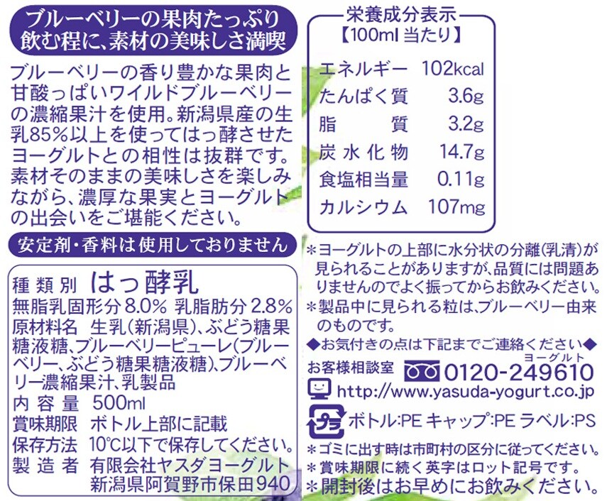 [冷蔵]ヤスダヨーグルト ブルーベリー 500ml×6本 | ブルーベリー果肉と濃縮果汁を使用した飲むヨーグルト