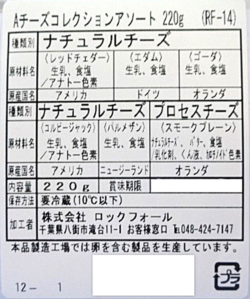 スモークプレーン2個・パルメザン2個・コルビージャック5個・レッドチェダー4個・ゴーダ5個・エダム4個入りのアソートです。