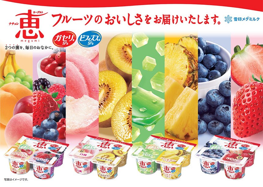 日本人のおなかを研究して選んだ2つの善玉菌「ガセリ菌SP株」と「ビフィズス菌SP株」を配合したフルーツ果肉入りヨーグルトです。「フルーツミックス」と「ベリーミックス」の4連タイプです。