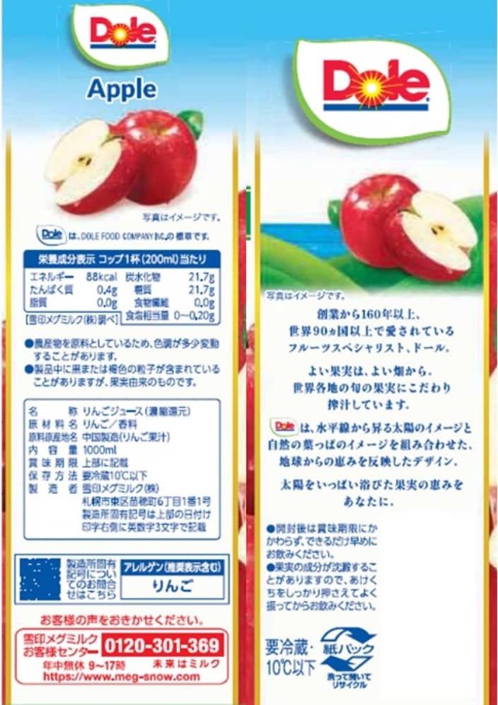 [冷蔵]雪印メグミルク Doleアップル100% 1000ml×3本 | 世界各地の旬の果実を使用しております。