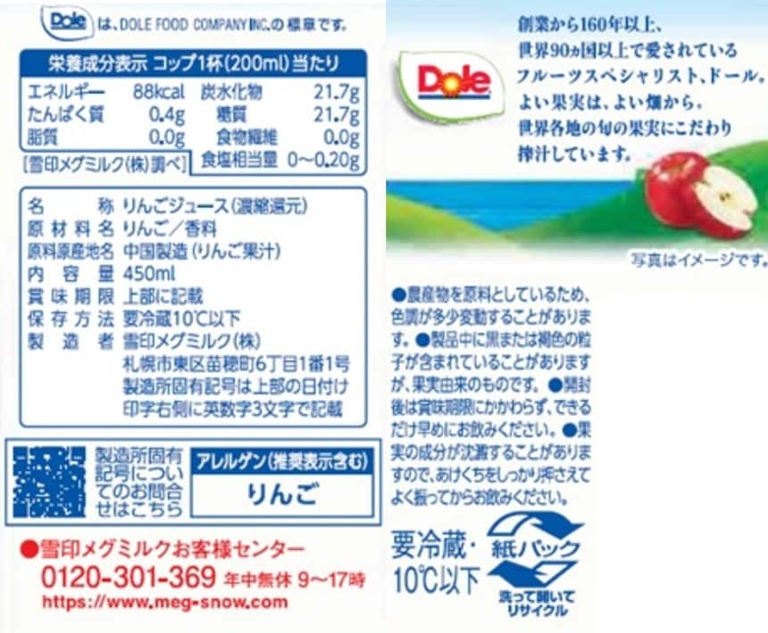 - [冷蔵]雪印メグミルク Doleアップル100% 450ml×12本