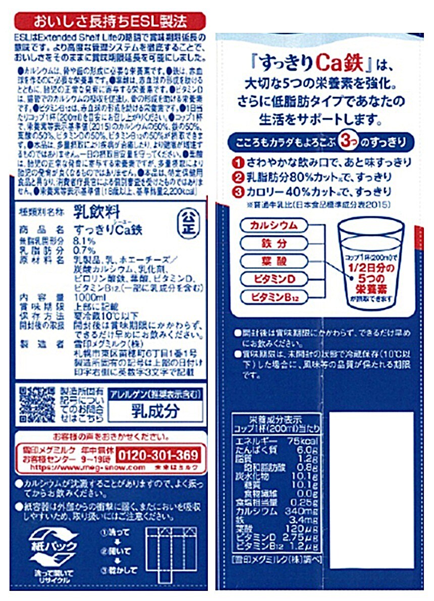 コップ1杯で1/2日分のカルシウム、鉄、葉酸、ビタミンD、ビタミンB12が摂れる乳飲料です。(低脂肪 脂肪分80%カット 普通牛乳比(日本食品標準成分表2015)、栄養機能食品(カルシウム、鉄、葉酸、ビタミンD、ビタミンB12))
