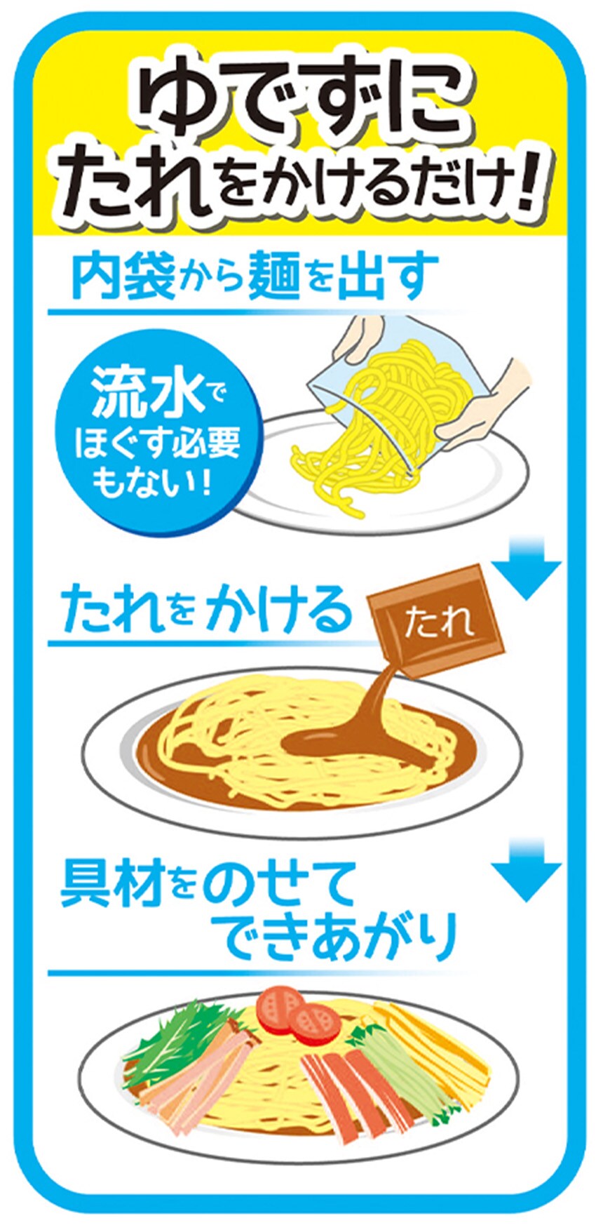 お鍋も水も使わないゆでずにたれをかけるだけ!しなやかでコシのあるめんと酸味をおさえた甘めの醤油だれです。