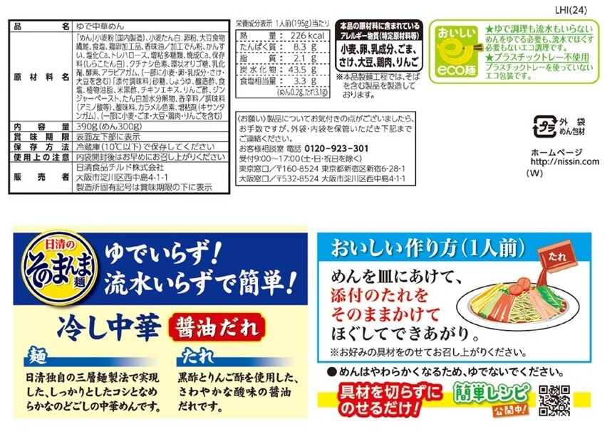 - [冷蔵]日清食品チルド 日清のそのまんま麺 冷し中華 醤油だれ 2人前×6袋