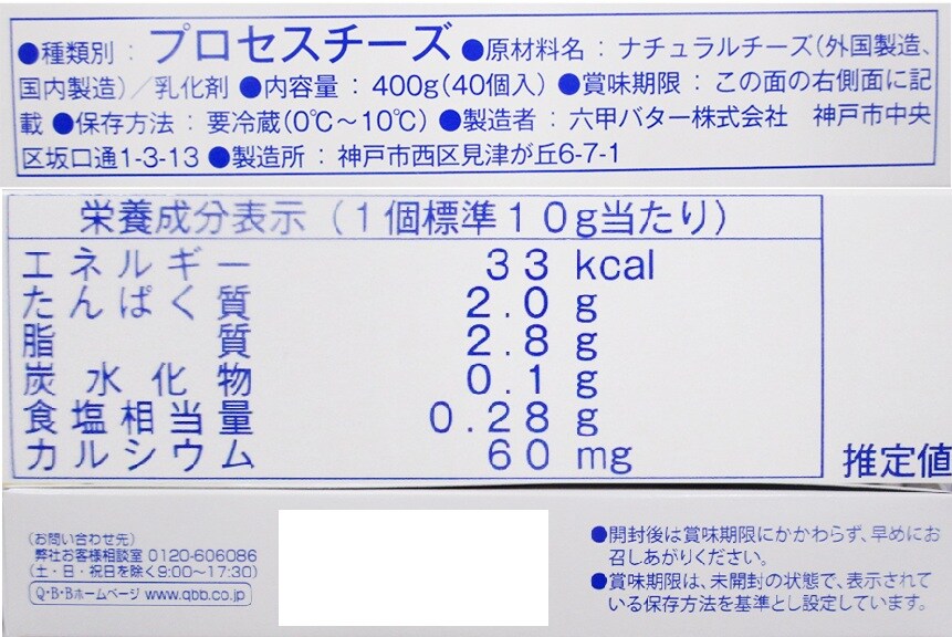 [冷蔵]六甲バター QBB 給食用ベビーチーズ (10g×40個入)×2箱 | チェダーチーズがベースの温和な風味と食べやすい大きさの個包装品です。
