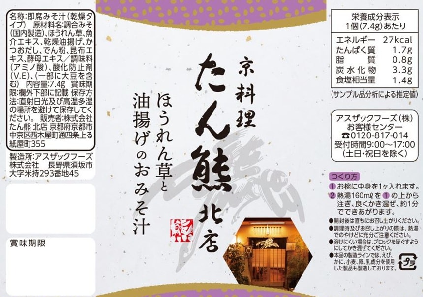 「お召し上がり方法」:器に本品を入れ、熱湯160mlを注ぎ約1分で出来上がります。