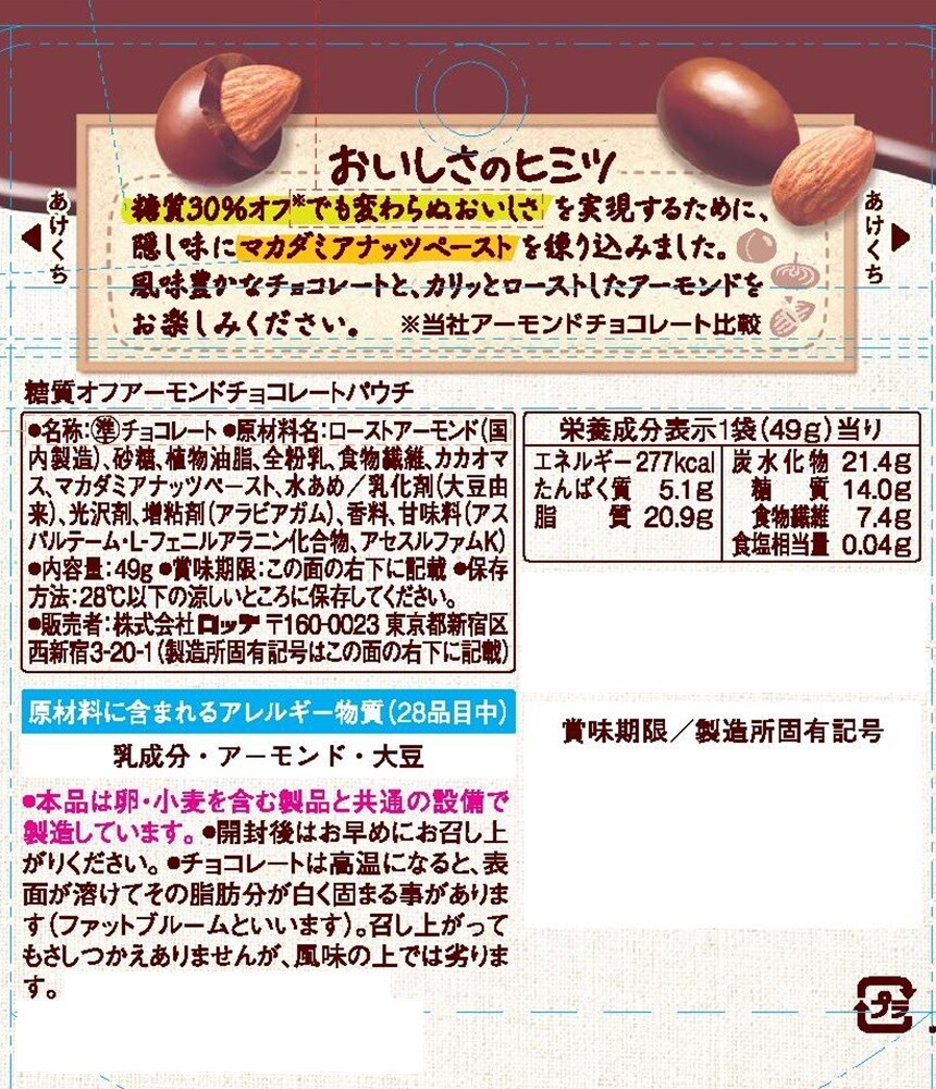 ロッテアーモンドチョコレートから登場の、おいしさそのままに糖質を30%オフしたタイプです。