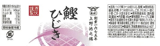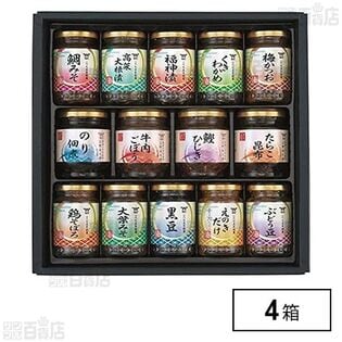 各1本ずつ:鰹ひじき 45g、たらこ昆布 50g、のり佃煮 125g、牛肉ごぼう 60g、くきわかめ 80g、鯛みそ 105g、福神漬 90g、ぶどう豆 105g、梅かつお 90g、高菜大根 65g、鶏そぼろ 50g、大葉みそ 105g、えのきだけ 90g、黒豆 105g