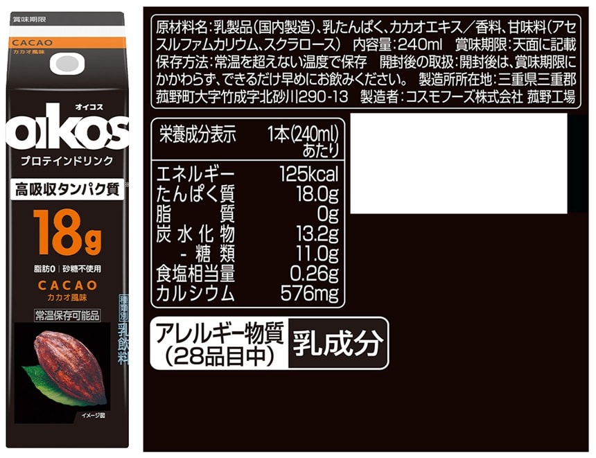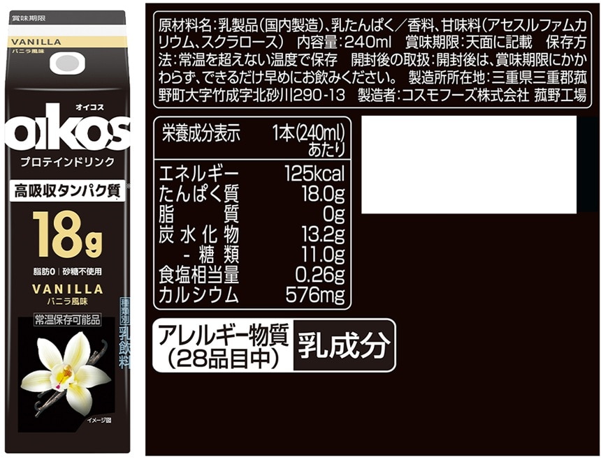 高吸収タンパク質18g、脂肪0・砂糖不使用。