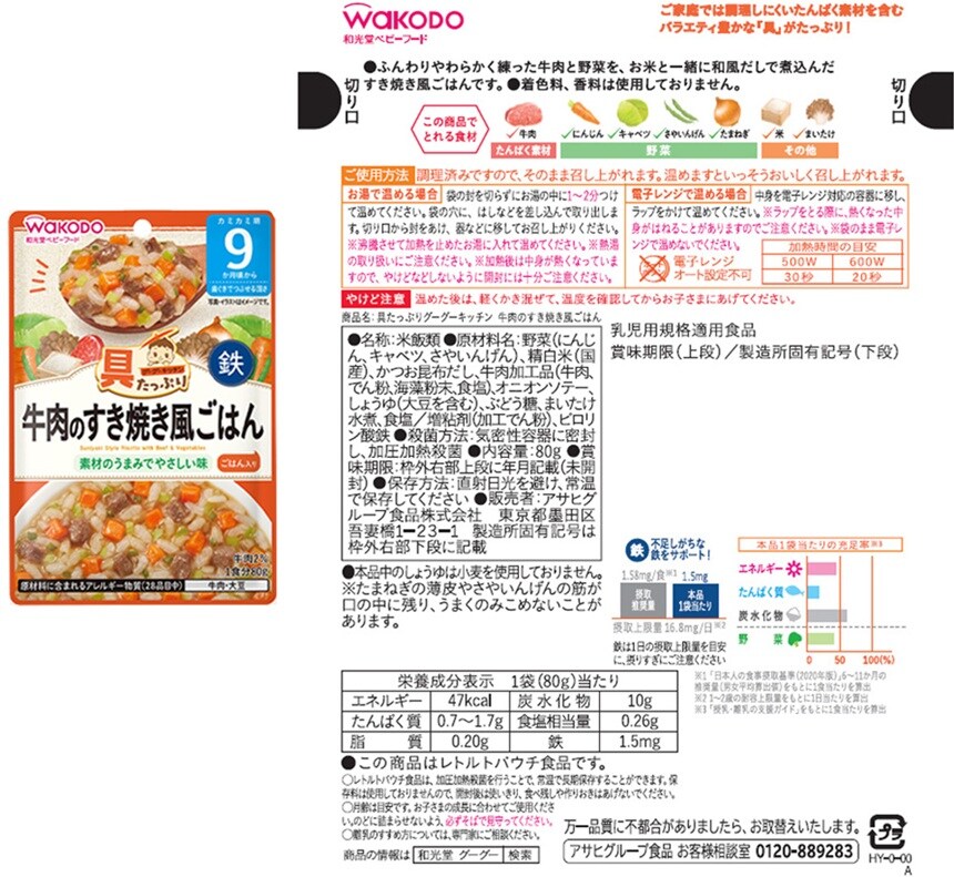 ふんわりやわらかく練った牛肉と野菜を、お米と一緒に和風だしで煮込んだすき焼き風ごはんです。本品中のしょうゆは小麦を使用しておりません。
