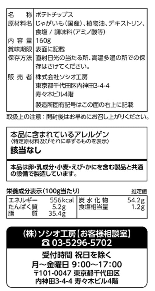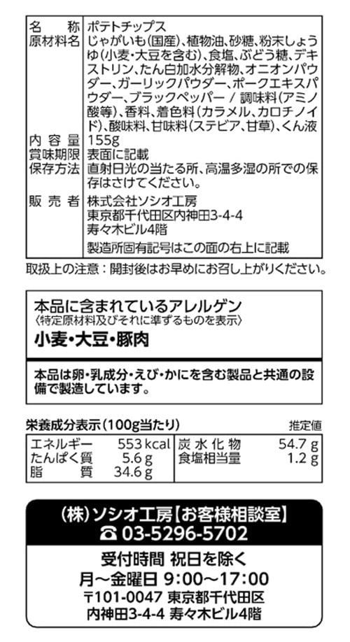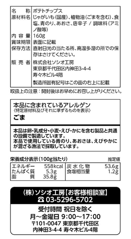 シンプルな塩味ベースのポテトチップスに「青のり」の豊かな香りが調和した味わいをお楽しみ下さい。
