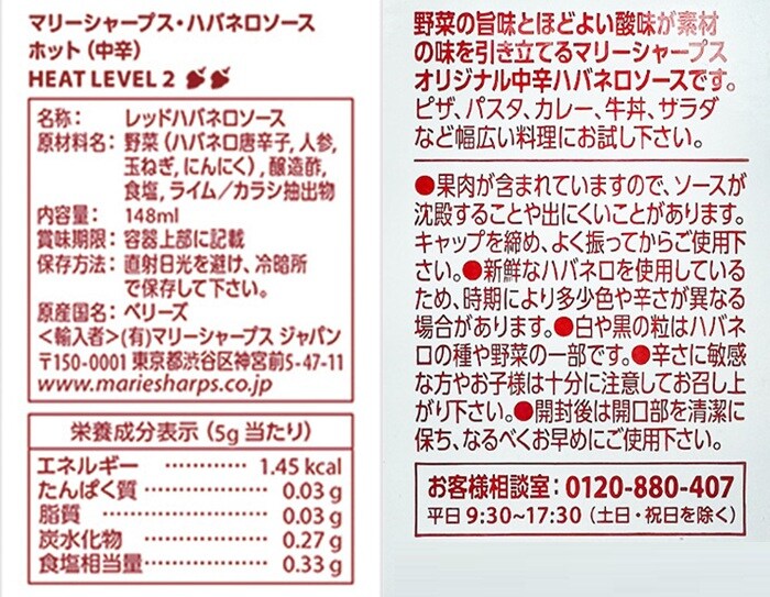- ・マリーシャープス・ハバネロソース ホット(中辛) 148ml×1本