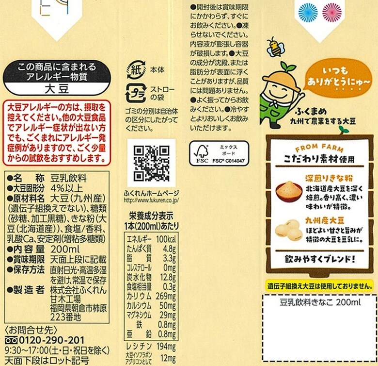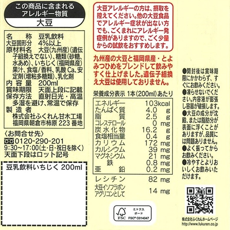 九州産「ふくゆたか」大豆を100%使用しました。遺伝子組換え大豆は使用しておりません。大豆固形分4%の豆乳飲料です。九州産「ふくゆたか」大豆の豆乳と福岡県のブランドいちじく「とよみつひめ」果汁をブレンドして、飲みやすく仕上げました。 国産原料(九州産ふくゆたか大豆福岡県産いちじく)を使用した、安心安全おいしさに拘った豆乳飲料です。