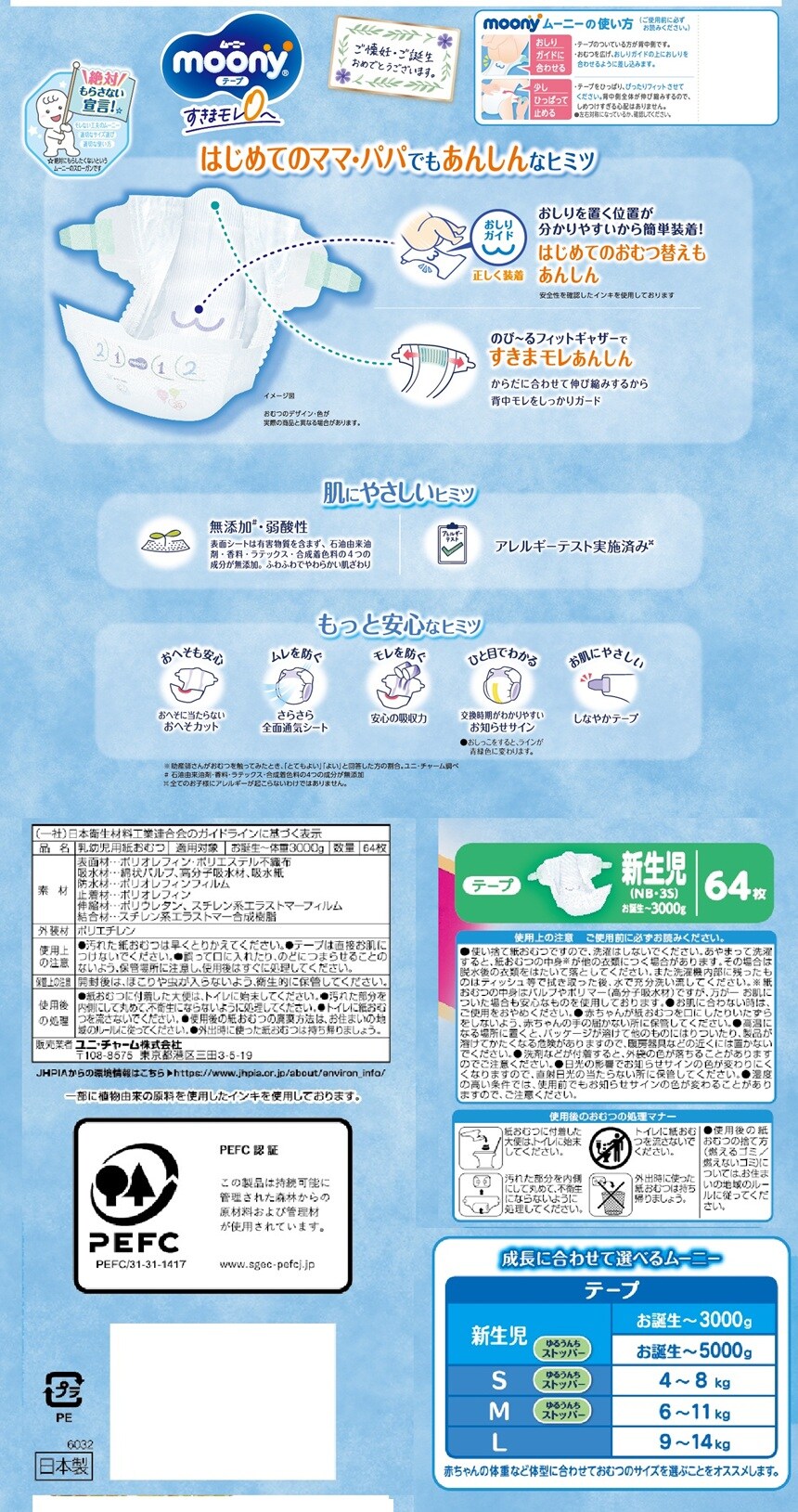 [計192枚]ユニ・チャーム ムーニー 新生児~3000G 64枚×3個 | 3000Gまでの赤ちゃんにもま~るくフィット!64枚入の大入数パック。