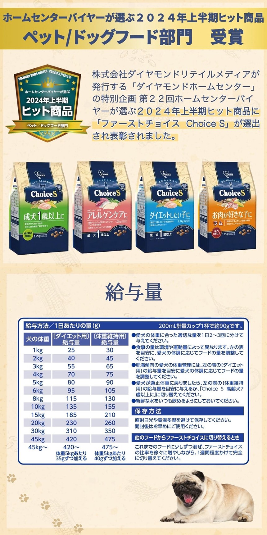 ●愛犬の体重管理、ダイエットのため、余分な脂肪分をカットし、低脂肪に仕上げています(「Choice S高齢犬7歳以上に」を基準として脂肪分38%カット)。