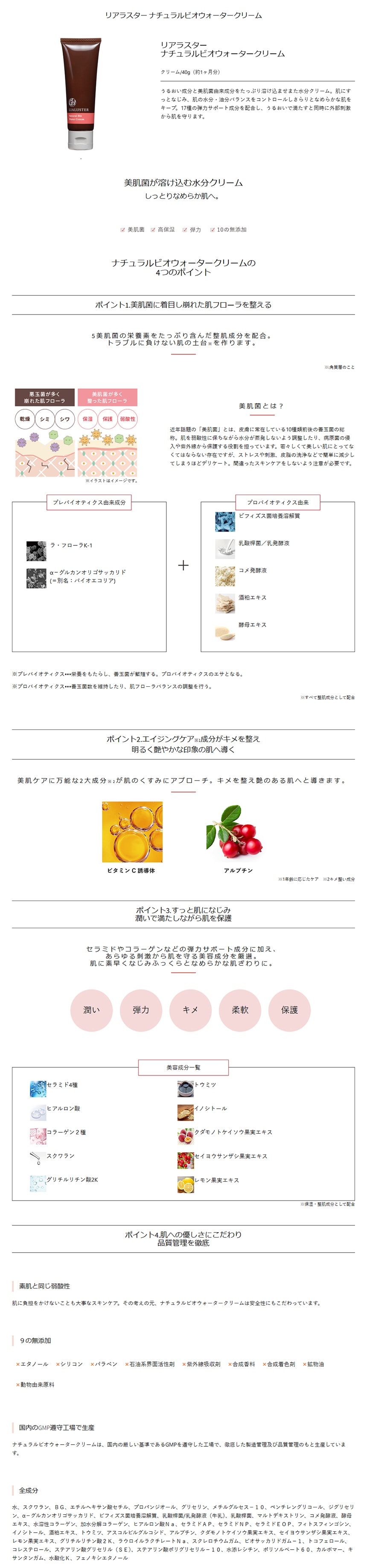 うるおい成分と美肌菌由来成分をたっぷり溶け込ませまた水分クリーム。肌にすっとなじみ、肌の水分・油分バランスをコントロールしさらりとなめらかな肌をキープ。17種の弾力サポート成分を配合し、うるおいで満たすと同時に外部刺激から肌を守ります。