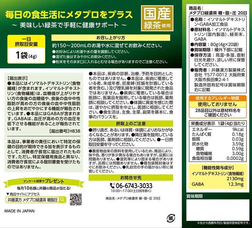 [4個]【機能性表示食品】井藤漢方製薬 メタプロ緑濃茶 糖・脂・圧 20日 80g(4g×20袋) | イソマルトデキストリン・GABA配合。機能性表示食品の"濃い”緑茶