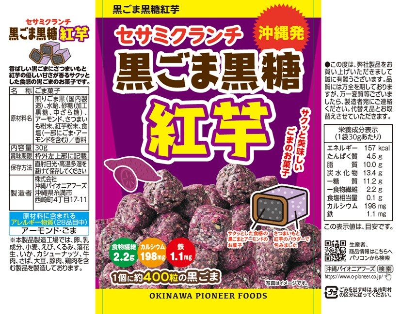香ばしい黒ごまとアーモンドのお菓子をさつまいも&紅芋の優しい甘さのパウダーで包んだ、サクッとした食感の美味しいごま菓子です。現代人に不足がちなカルシウム、食物繊維がたっぷり含まれています。
