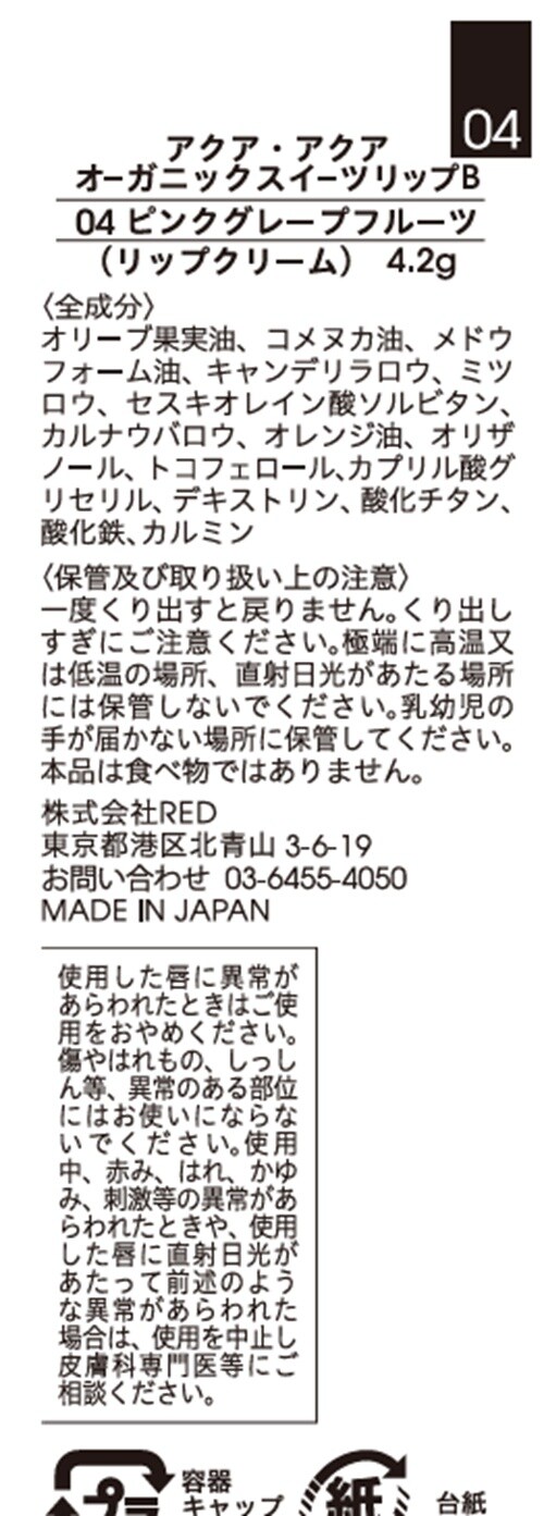 [6個]RED アクア・アクア オーガニックスイーツリップB 04 ピンクグレープフルーツ 4.2g ※リニューアル前商品 | リップクリームのツヤ感&うるおい×ルージュの発色!
