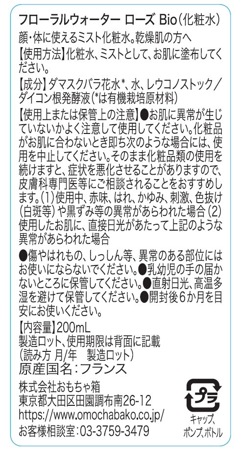 [2本]おもちゃ箱 フローラム フローラルウォーター ローズ Bio 200ml | フレッシュで爽やかな香り。肌のバランスをサポートしてくれます。すべての肌質の方におすすめです。