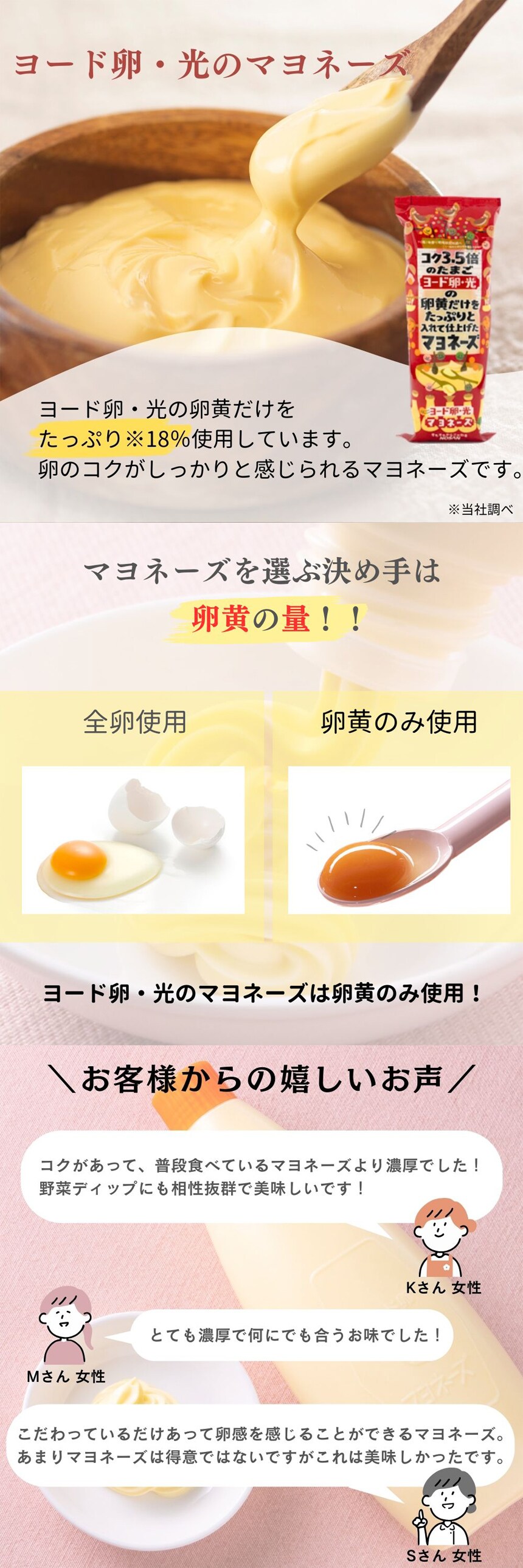 ヨード卵・光の卵黄だけをたっぷり*18%使用することで、コクのある美味しさを引き出しました。