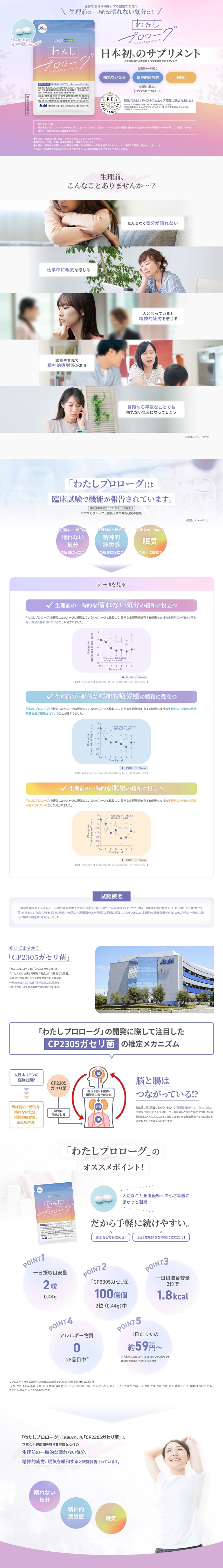 届出表示:本品には、CP2305ガセリ菌(L. gasseri CP23055)が含まれており、正常な月経周期を有する健康な女性の月経前の一時的な晴れない気分、精神的疲労感、眠気を軽減する機能があります。
