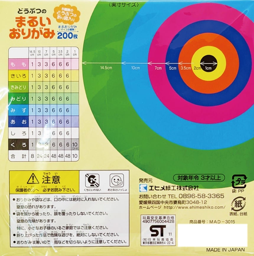 - どうぶつのまるいおりがみ サイズ6種 200枚入(シール10枚付)