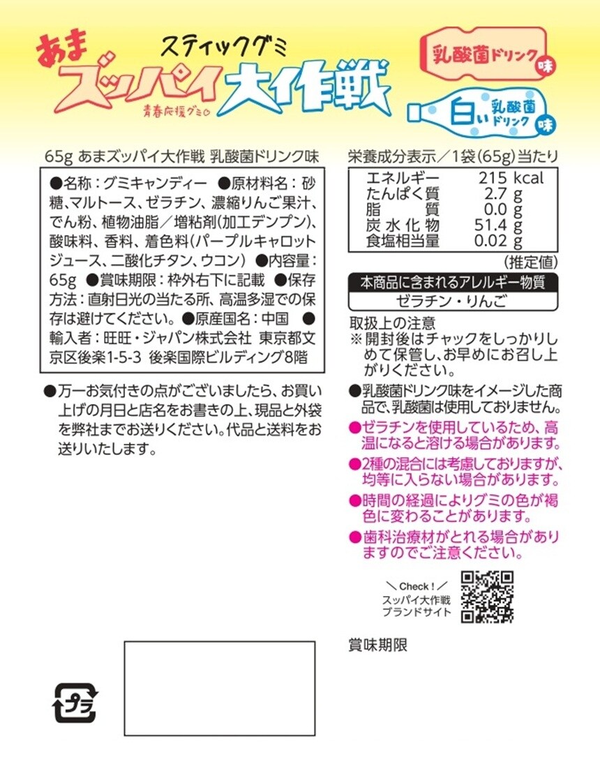 [60個]旺旺・ジャパン あまズッパイ大作戦 乳酸菌ドリンク味 65g | ハードな噛み応えのあるスティックタイプのグミです