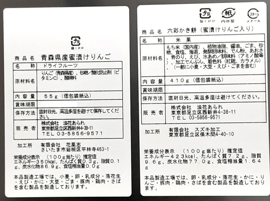 6種類の味付けをしたかき餅と青森県産の蜜漬けりんごの詰合せ