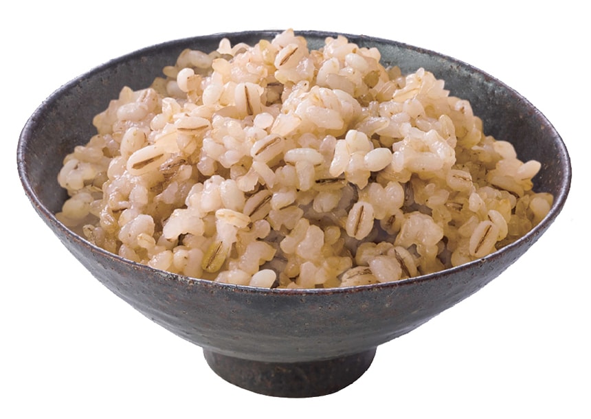 新潟県産こがねもち玄米にもち麦をブレンドしたもちもち食感が特徴的な市場にない包装米飯。