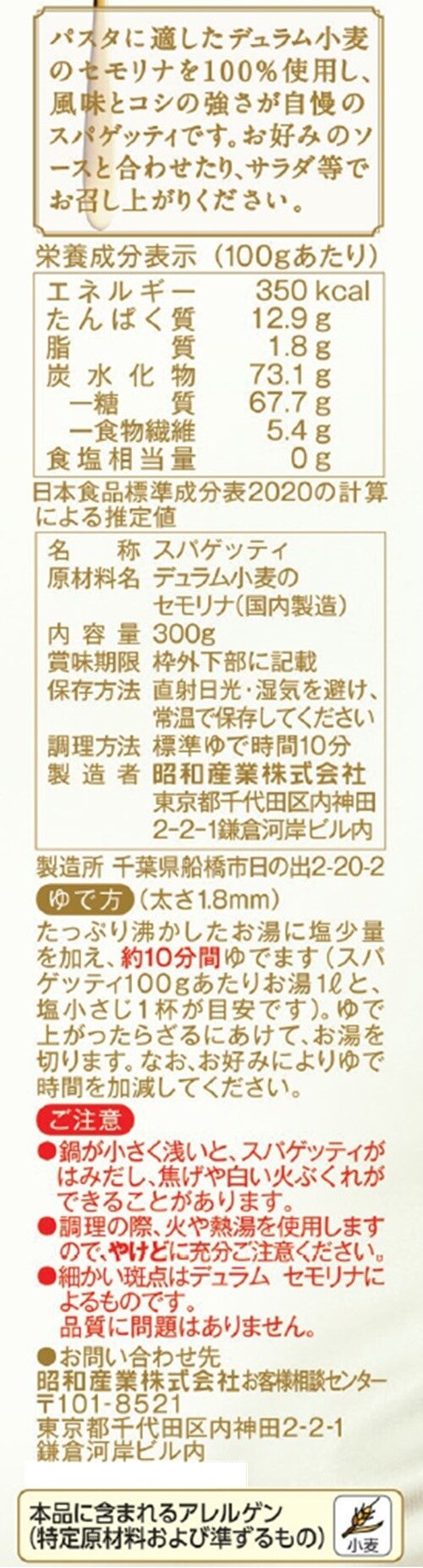 【スパゲッティ】100gあたり エネルギー350kcal たんぱく質12.9g 脂質1.8g 炭水化物73.1g 食塩相当量0g