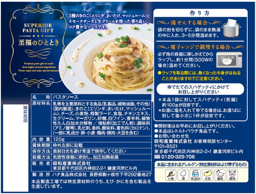 【3種のきのこの燻製薫るチーズクリームソース】1袋(120g)あたり エネルギー140kcal たんぱく質3.8g 脂質10.8g 炭水化物6.8g 食塩相当量1.8g