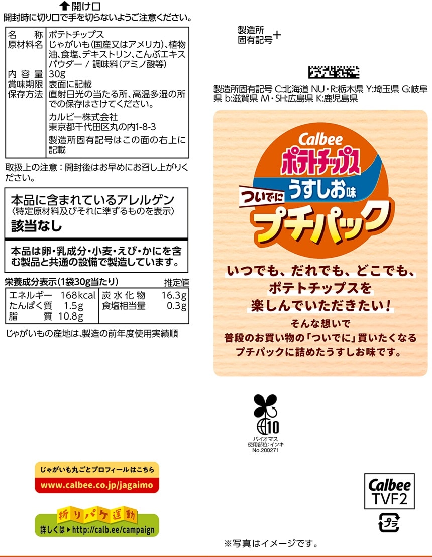 いつでも、だれでも、どこでも、ポテトチップスを楽しんでいただきたい!そんな想いで、普段のお買い物の「ついでに」買いたくなる、プチパックに詰めたうすしお味です。