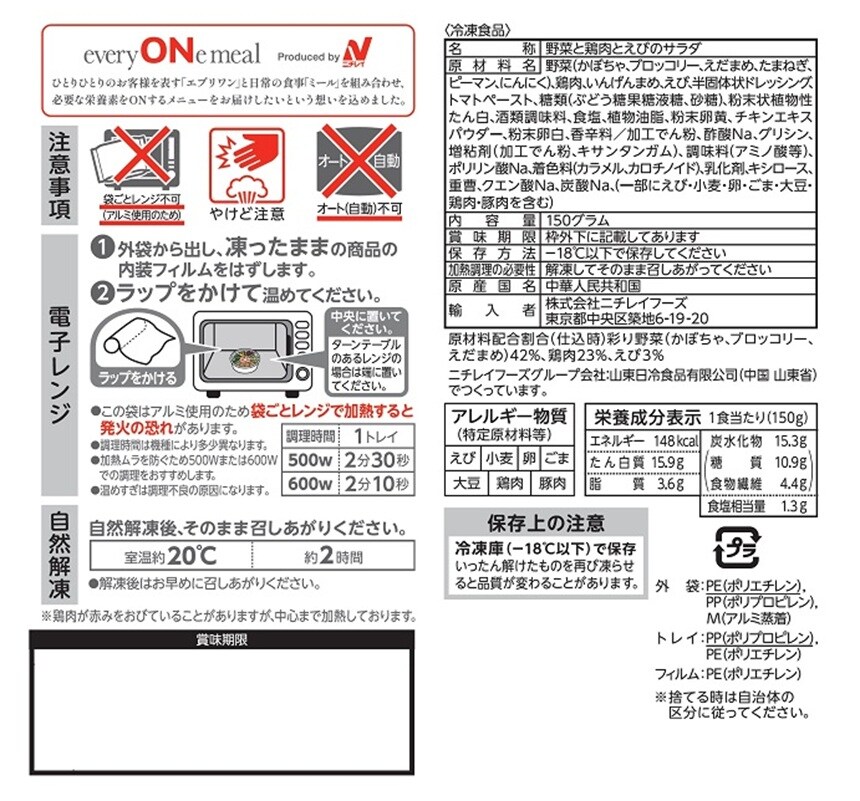 - [冷凍]【6個】ニチレイ everyONe meal グリルチキンとえびの彩り野菜ボウル 150g