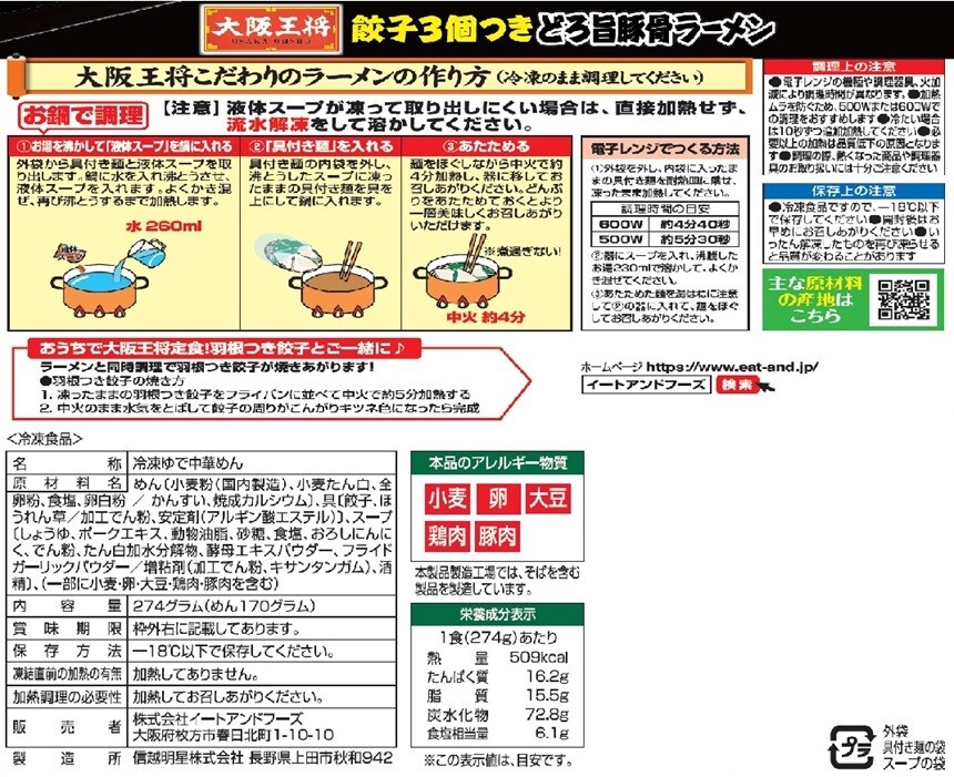 - ・大阪王将 餃子3個つきどろ旨豚骨ラーメン 274g×16袋