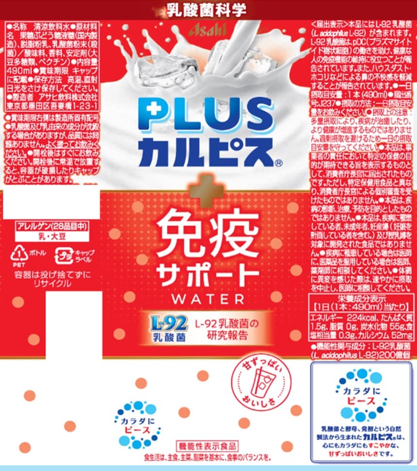[48本]アサヒ飲料 「PLUSカルピスⓇ免疫サポートウォーター」PET 490ml | 長年の乳酸菌研究により選び抜かれたL-92乳酸菌を配合した「カルピス」です。