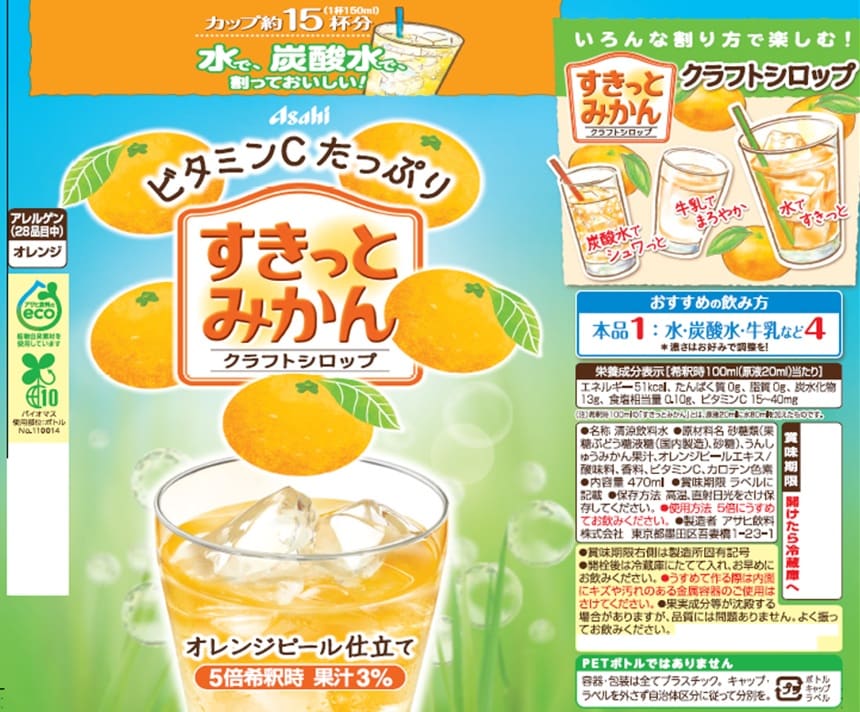 みかん果汁にオレンジピールエキスを加えた、心もカラダもすっきりとリフレッシュできて爽やかな味わいが楽しめる希釈タイプの飲料です。
