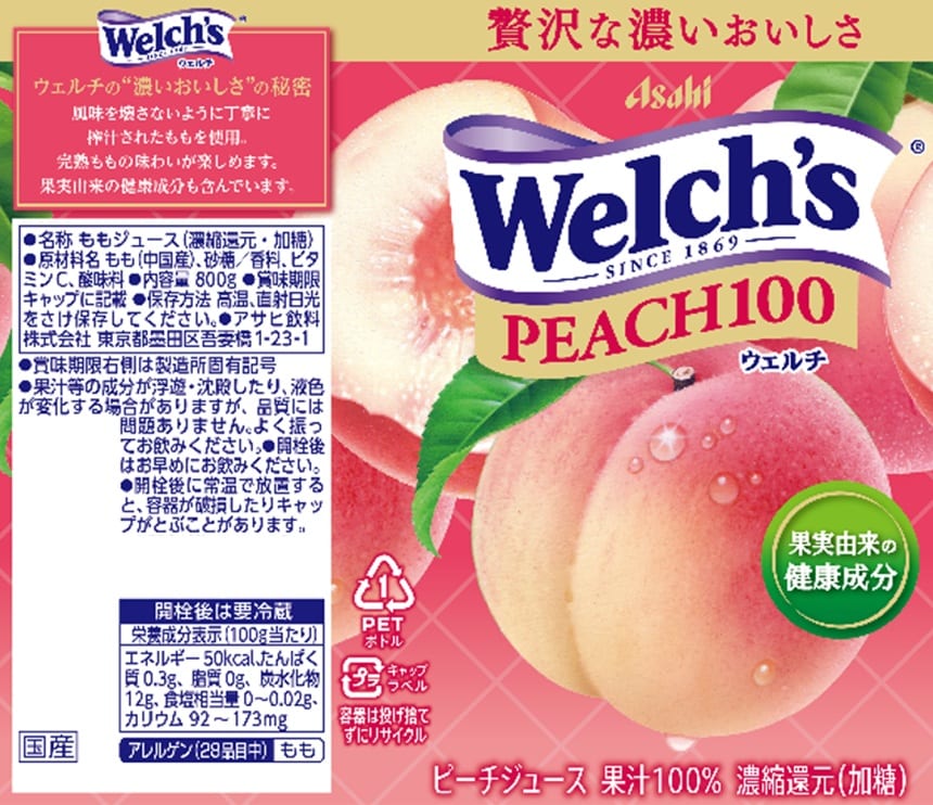 [8本]アサヒ飲料 Welch’sピーチ100 PET 800g | 品質感ある果実の特別なおいしさで、疲れた気分のときや一日の終わりにほっと一息を提供してくれる果汁飲料