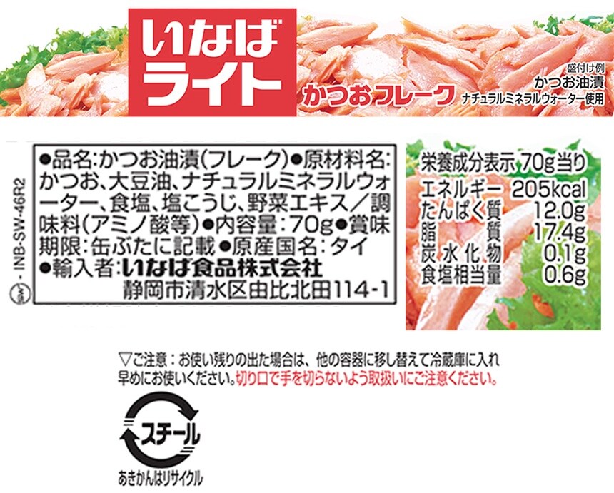 [計24缶]いなば食品 ライトフレーク 70g×4缶入パック×6個 | 鮮度にこだわったかつおを使用したツナ缶です。