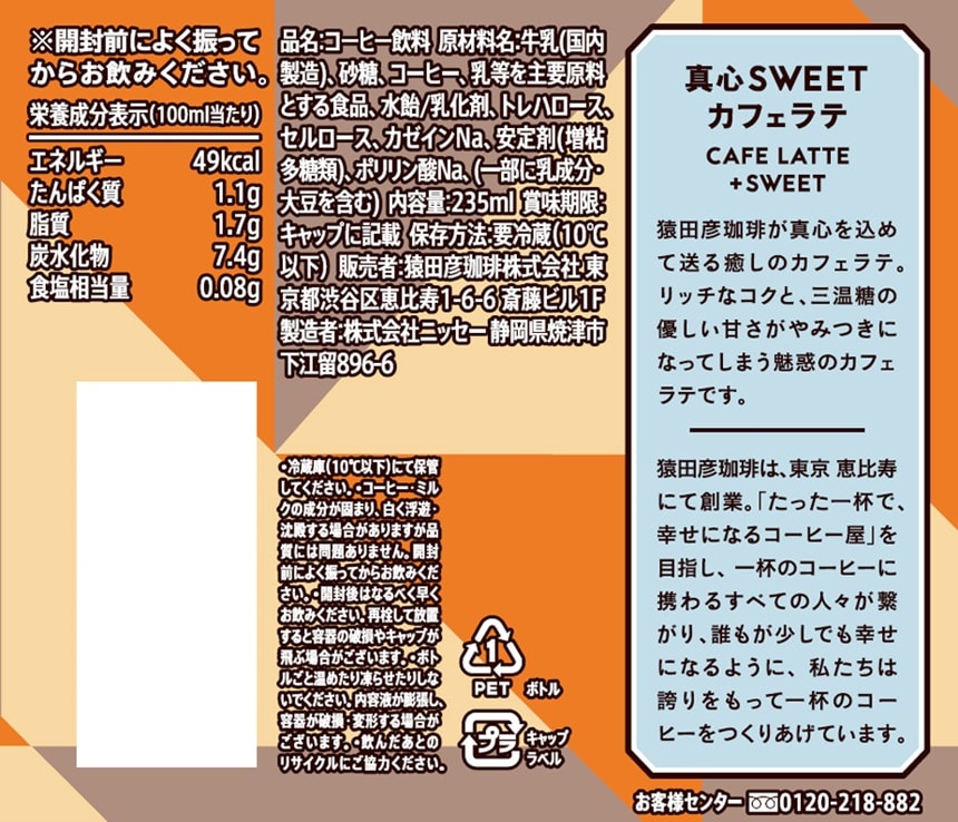 [冷蔵] 猿田彦珈琲 真心SWEETカフェラテ(加糖) 235ml×12本 | 三温糖のまろやかな甘さが魅力のカフェラテ。