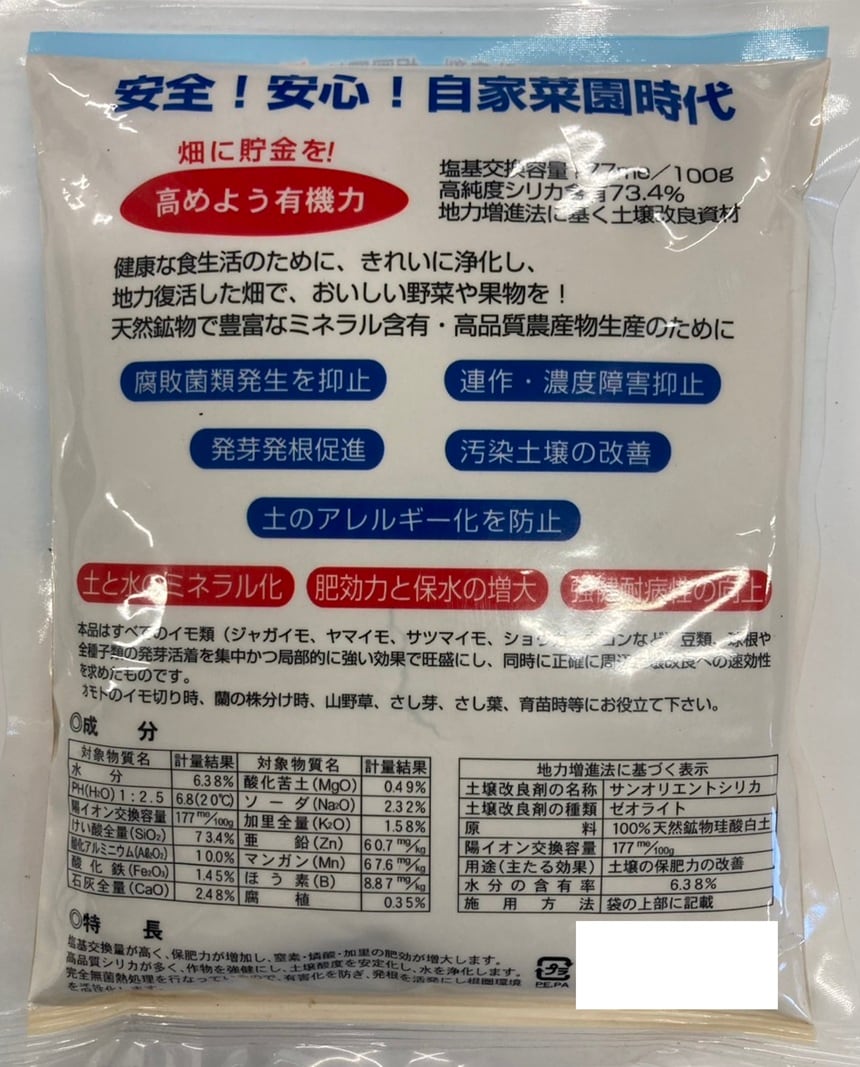 すべてのイモ類(じゃがいも、山芋、さつもいも、しょうが、レンコンなど)、豆類、球根や全種子類の発芽活着を集中かつ局部的に強い効果を速効性を持つ。