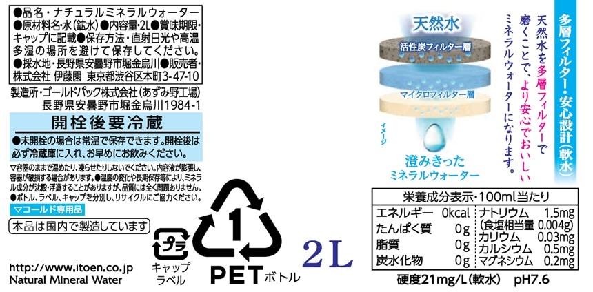 良質な水源の天然水を、活性炭とマイクロフィルターで更に磨き上げた、安心品質のミネラルウォーターです。
