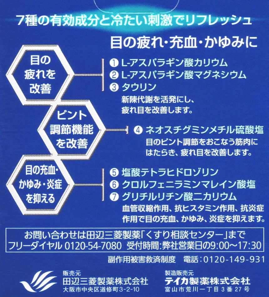 細胞に栄養を与えるL-アスパラギン酸をはじめ7つの有効成分で、疲れ目や充血、かゆみなどの炎症を取り去ります。