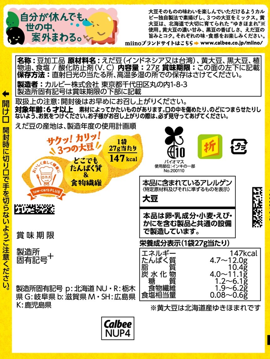[12個]カルビー ミーノ 3つの大豆ミックス 27g | 黄大豆(※)、えだ豆、黒豆の3つの大豆をミックス※黄大豆は北海道産ゆきほまれです