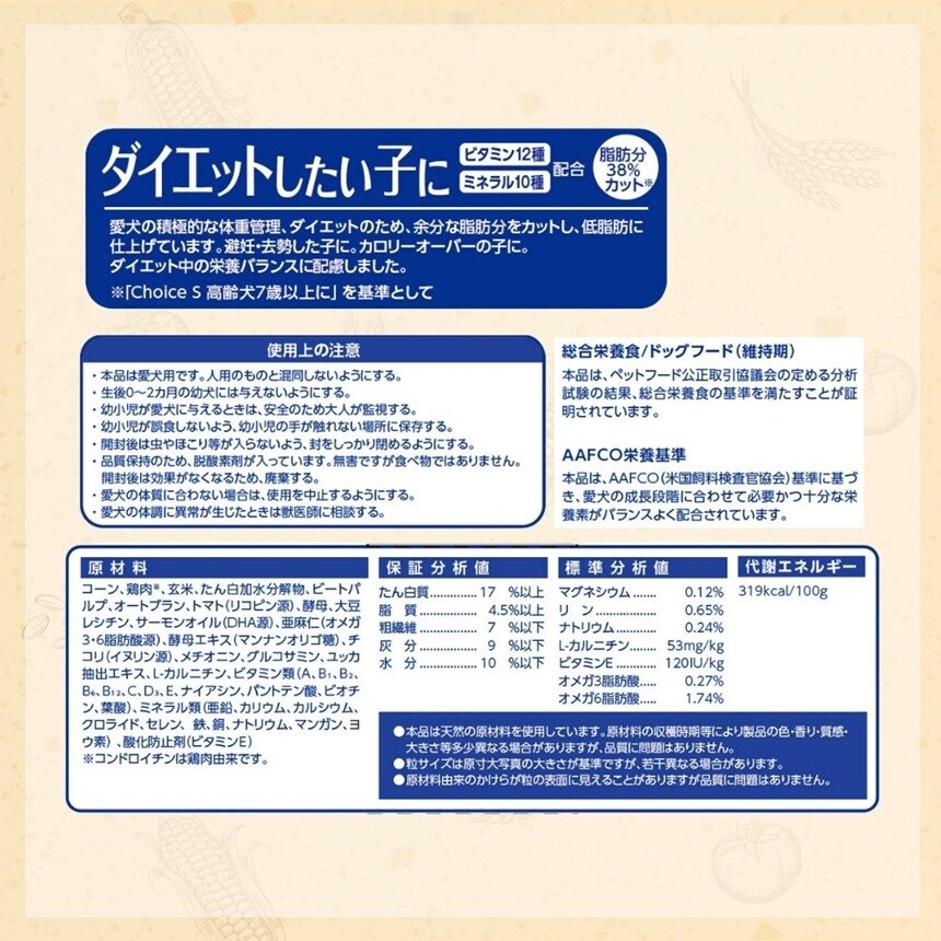 ●愛犬の体重管理、ダイエットのため、余分な脂肪分をカットし、低脂肪に仕上げています(「Choice S高齢犬7歳以上に」を基準として脂肪分38%カット)。