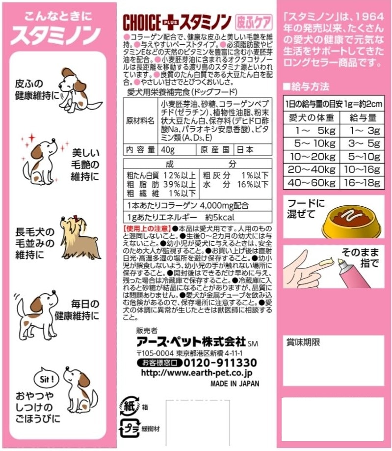 [12個]アース・ペット チョイスプラス スタミノン 皮ふケア 40g | 健康な皮ふと美しい毛づやの維持に。コラーゲン配合。