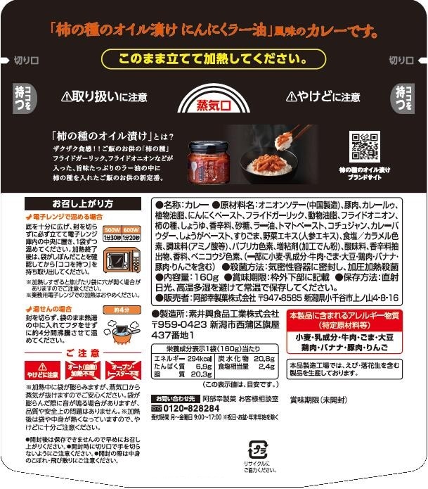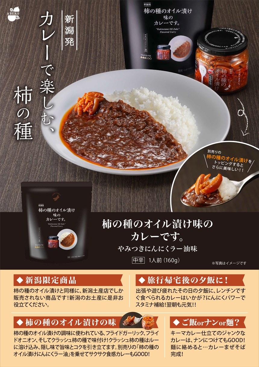 新潟の定番土産「柿の種のオイル漬けにんにくラー油」の味のレトルトカレー。