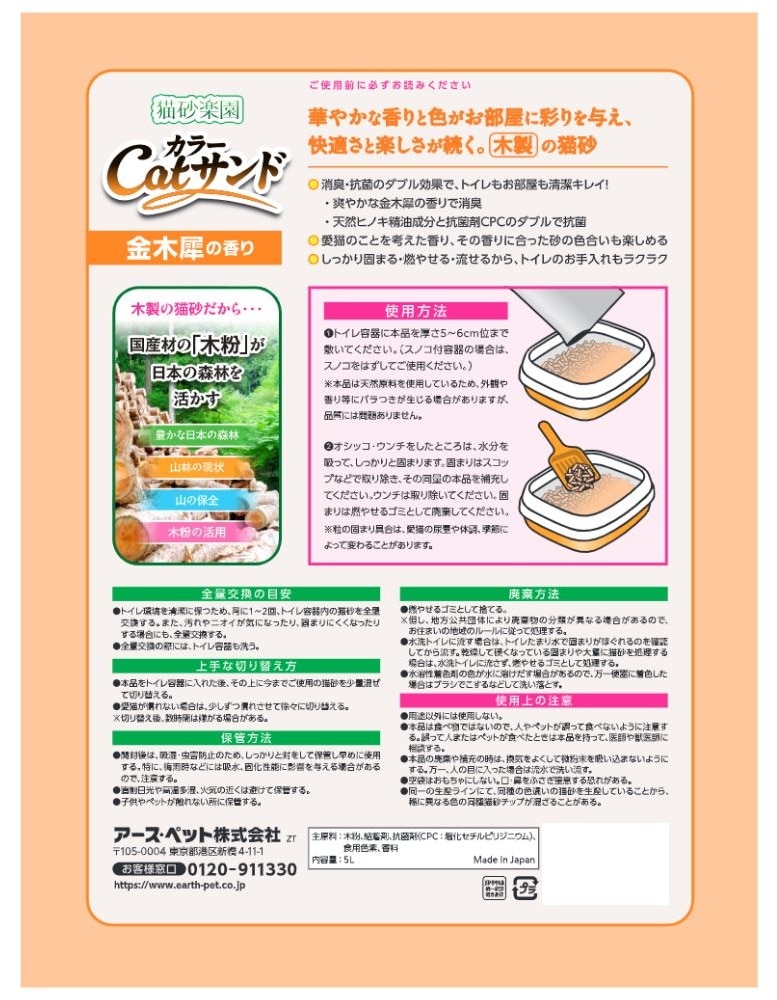 [20個]アース・ペット 猫砂楽園 カラーCATサンド 金木犀の香り 木製猫砂 5L | 金木犀の香りと色で快適さと楽しさを!固まる・燃やせる・流せる!木製の猫砂。